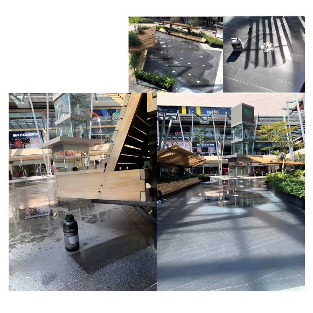 El Reto: Salitre y Desgaste en la Fuente Principal La fuente principal de Midtown Jalisco es el corazón visual de la plaza, recubierta con elegante granito negro. Sin embargo, al estar en contacto permanente con el agua y a la intemperie, enfrentaba dos grandes enemigos: la formación de salitre (esas manchas blancas que arruinan la piedra) y el desgaste por el alto tráfico de personas que circulan alrededor. El objetivo era blindar la piedra para que mantuviera su color negro intenso sin mancharse.